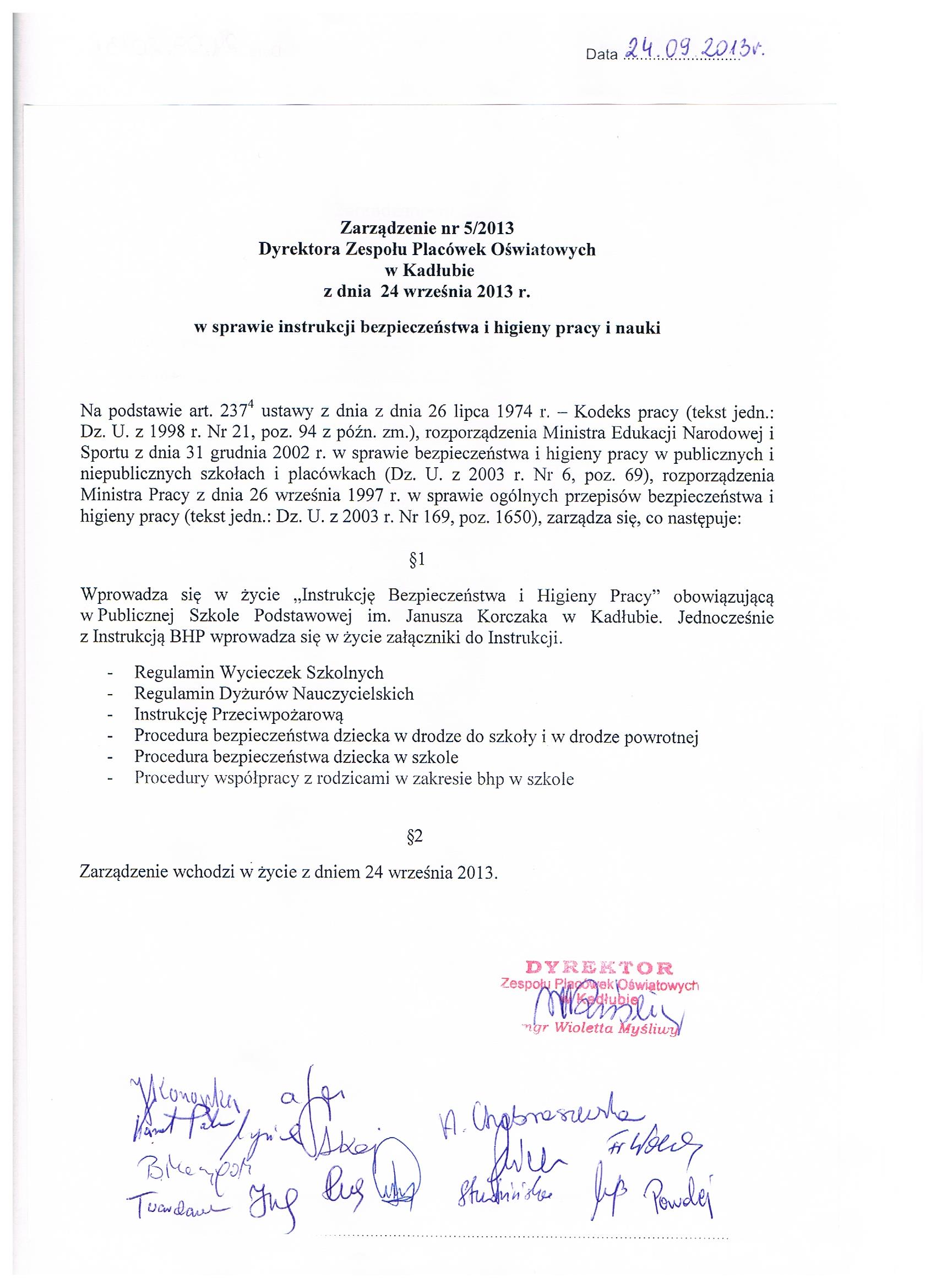 Zarządzenie Nr 5/2013 Dyrektora Zespołu Placówek Oświatowych w Kadłubie z dnia 24 wrzesień 2013 roku instrukcji bezpieczeństwa i higieny pracy i nauki