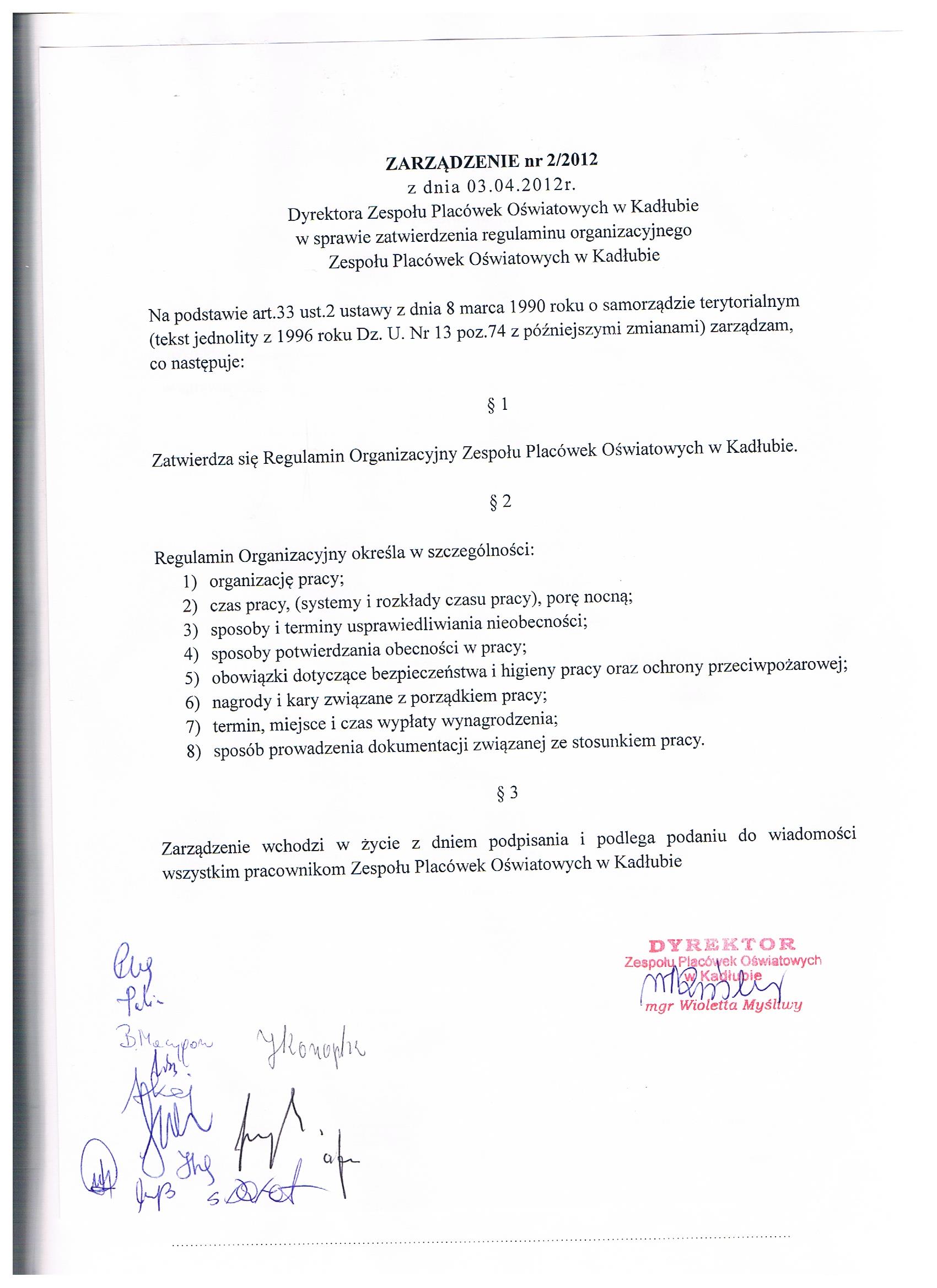 Zarządzenie Nr 2/2012 Dyrektora Zespołu Placówek Oświatowych w Kadłubie z dnia 3 kwiecień 2012 roku zatwierdzenia regulaminu organizacyjnego Zespołu Placówek Oświatowych w Kadłubie